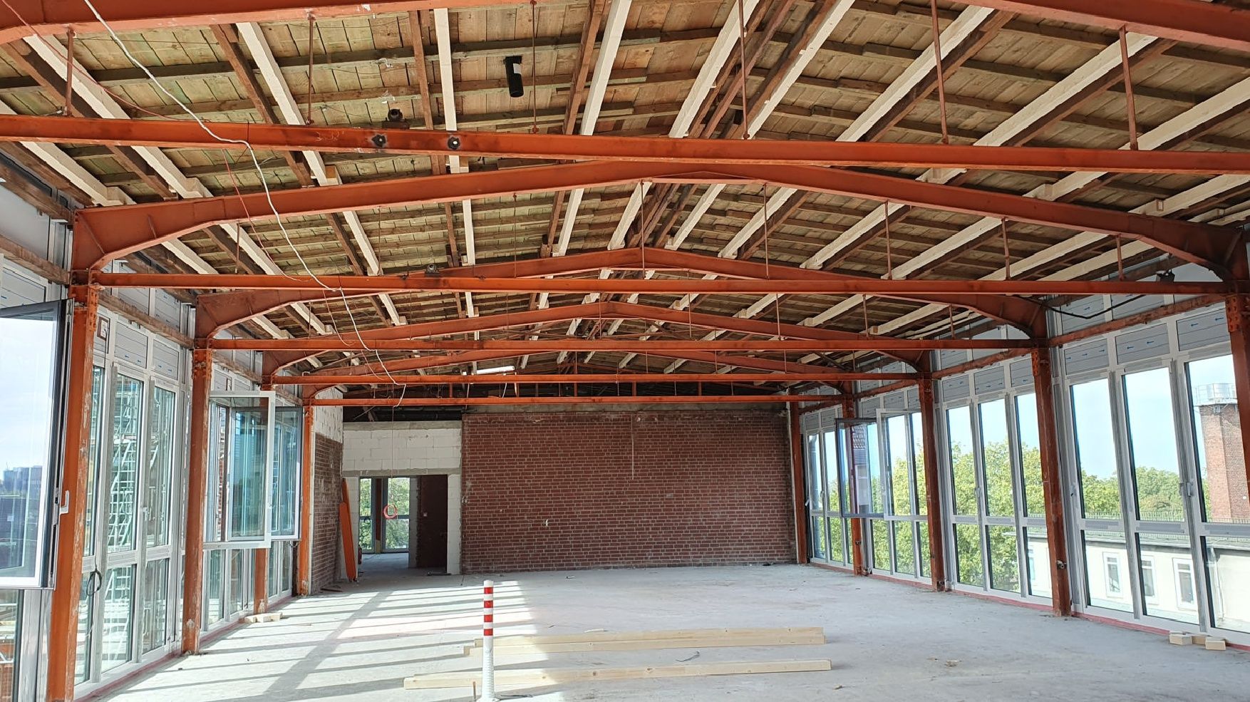Statt einfach weiter wie gehabt zu bauen, wurde diese erste Ausführung auf den Prüfstand gestellt. Zusammen mit der Tragwerksplanung wurde dem Gedanken des Green Campus nachgekommen und eine Lösung unter Verwendung von nachhaltigen Baustoffen entwickelt. Eine Ertüchtigung der vorhandenen Tragkonstruktion mit Holz führt zum gleichwertigen Ergebnis.