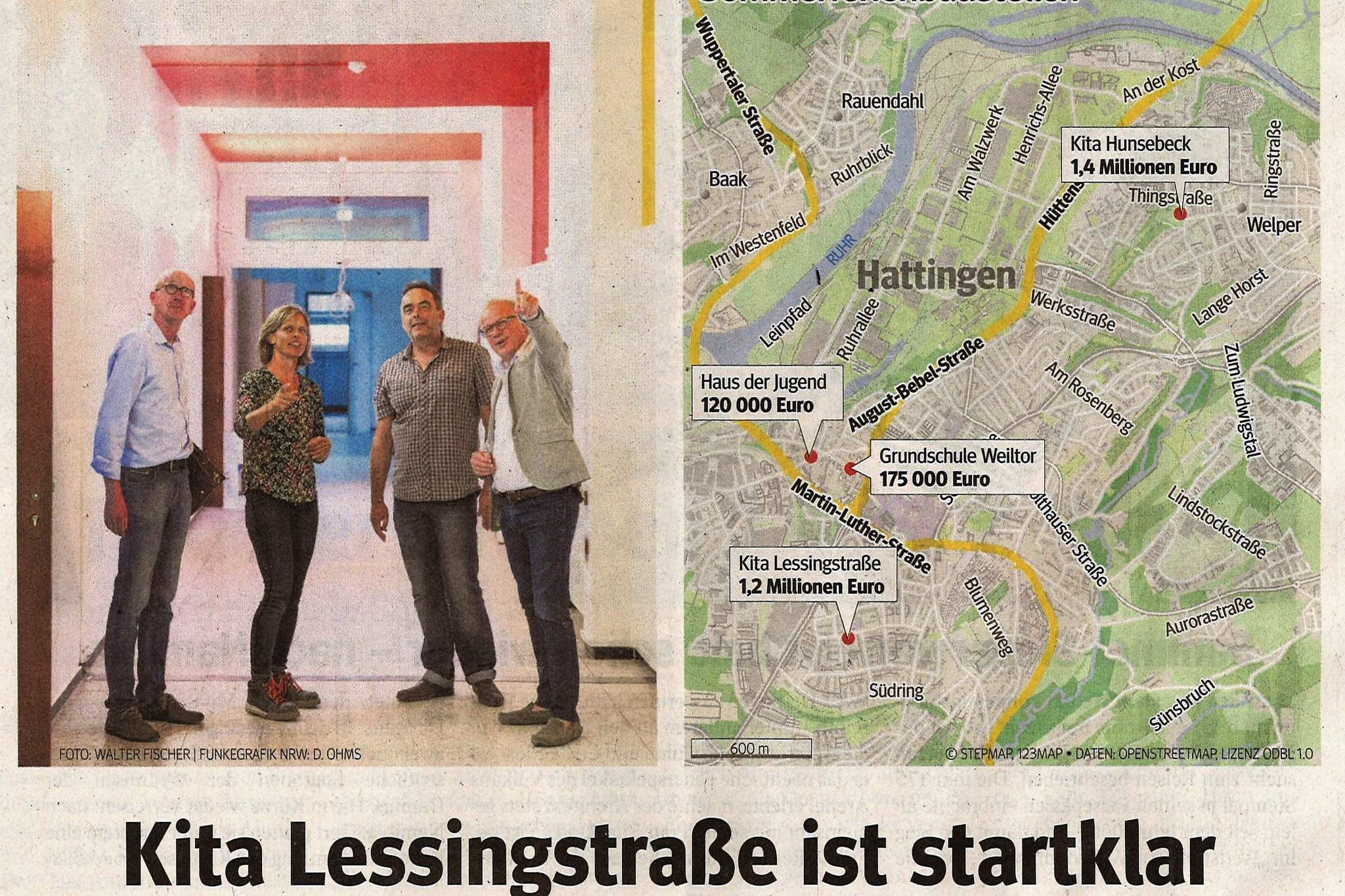 Kurz bevor die Kinder ihre Kita in Beschlag nehmen, steht ein WAZ-Pressetermin mit Hattingens Bürgermeister Dirk Glaser und dem Leiter der Gebäudewirtschaft Ulrich Möller auf der Noch-Baustelle. Sympathisch – Der Bürgermeister ist begeistert über den Maßstab der Einrichtung für die kleinen Nutzer zum Beispiel in den Sanitärräumen.