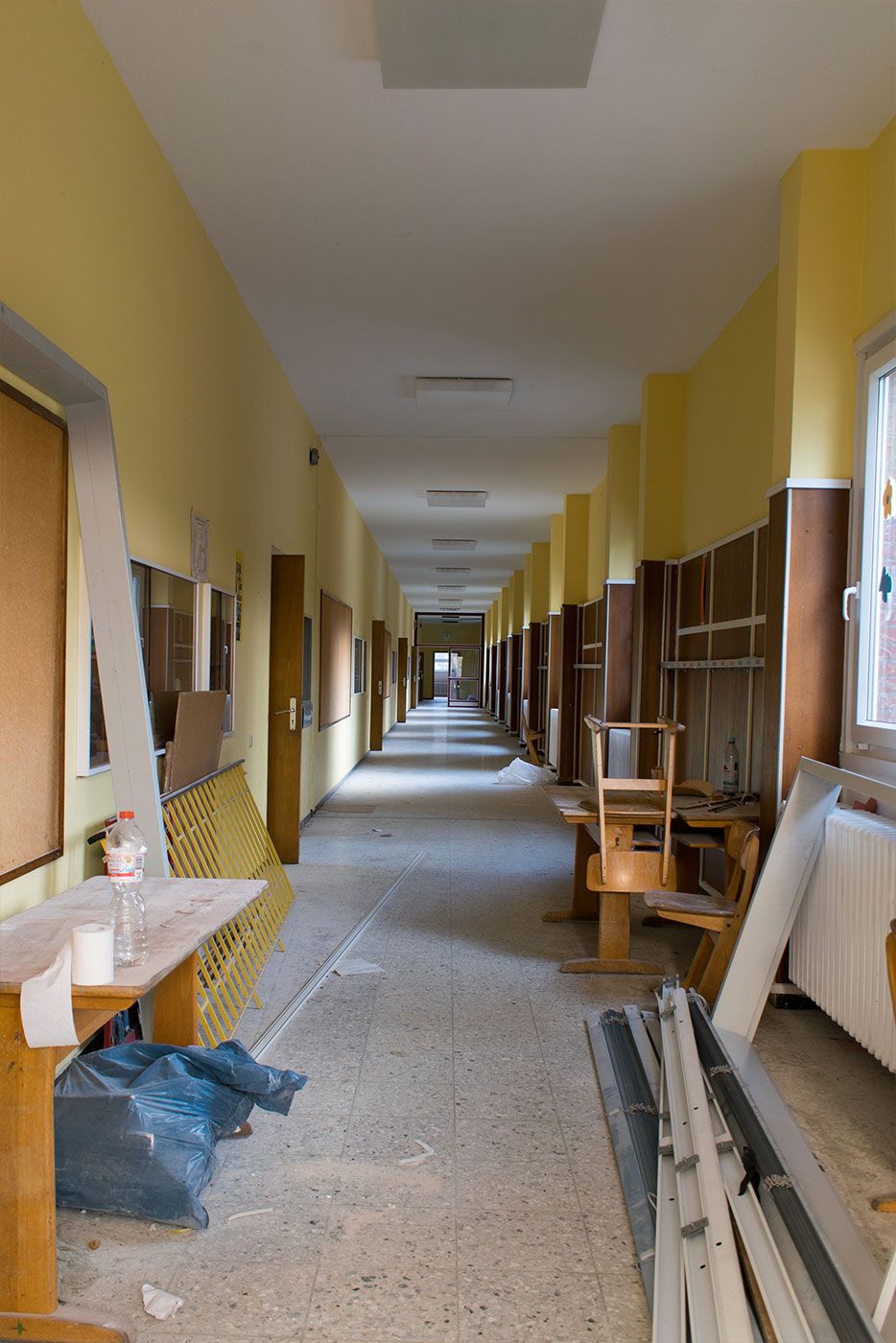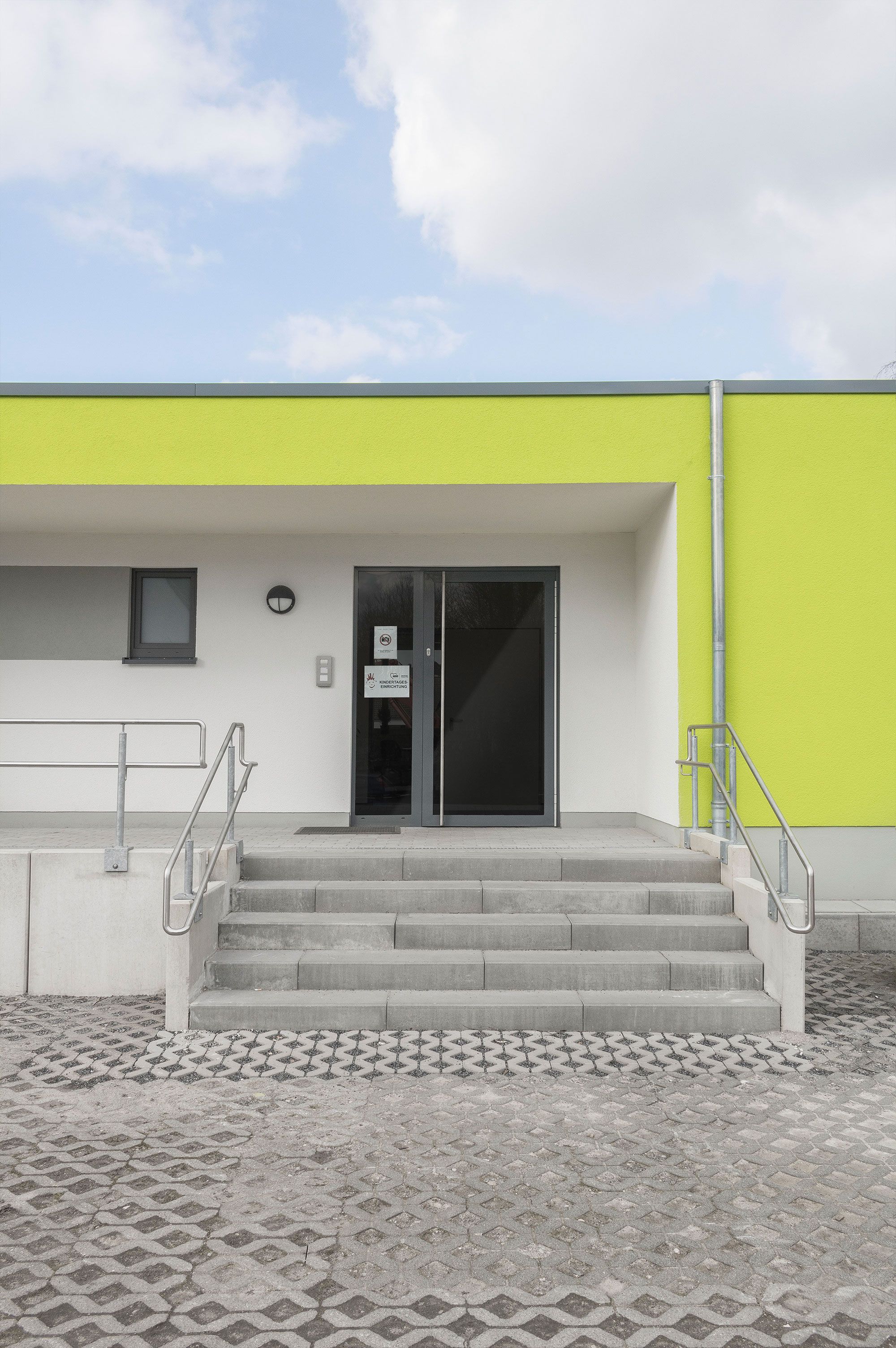 Die Grundschule „Alte Bruchfeldschule“ in Hattingen sollte umgenutzt werden. Im Erdgeschoss zog eine 4-gruppige Kita ein, in Teilen des Obergeschosses wurden die Sozialräume untergebracht. Der neu errichtete Anbau in Holzrahmenbauweise vermittelt die vorhandenen Höhenunterschiede und nimmt neben dem großen Mehrzweckraum auch den großzügigen Eingangsbereich auf. Im Übergang zum Außenspielgelände wurden den Gruppenräumen eine Terrasse mit kleinen Beeten und Sitzmöglichkeiten vorgelagert.