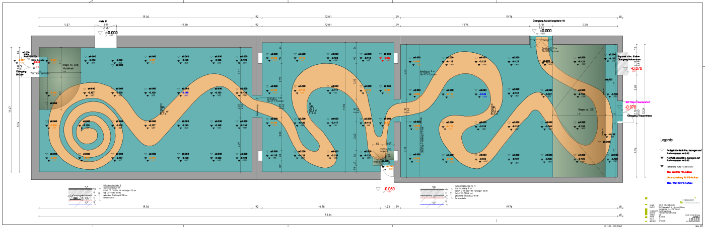 Über 600 m² Ausstellungshallen wurden bis zur Rohkonstruktion zurück gebaut. Die im Bestand vorgefundenen erheblichen Unebenheiten mussten mit minimalen Konstruktionen ausgeglichen werden. Das Ausstellungsdesign wurde in dem Fußbodenbelag übernommen.